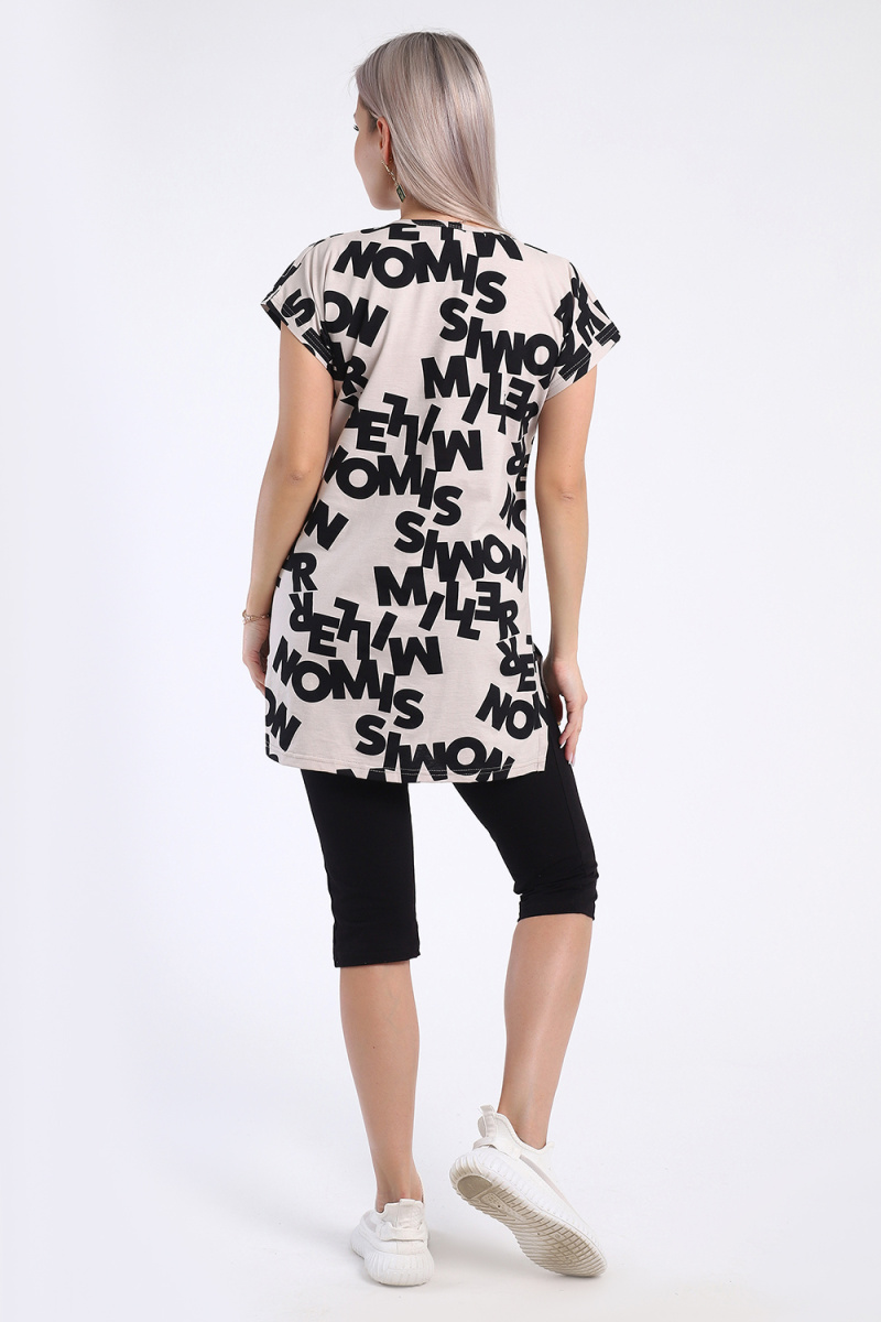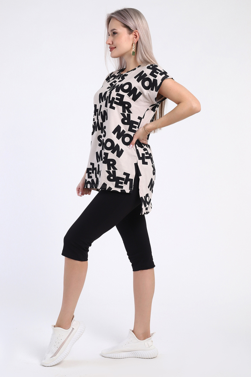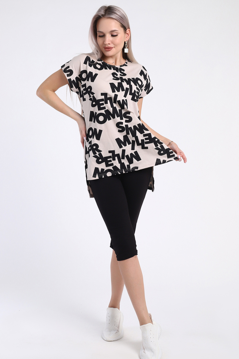 Женский костюм из футболки и бриджей — отличный выбор для дачного сезона и прогулок. Футболка в бежевом или оливковом цвете с набивным принтом в виде крупных букв придаёт образу современный и стильный вид. Бриджи черного цвета из 100% хлопка обеспечивают комфорт и свободу движения, что особенно важно для активного отдыха на свежем воздухе или дома.